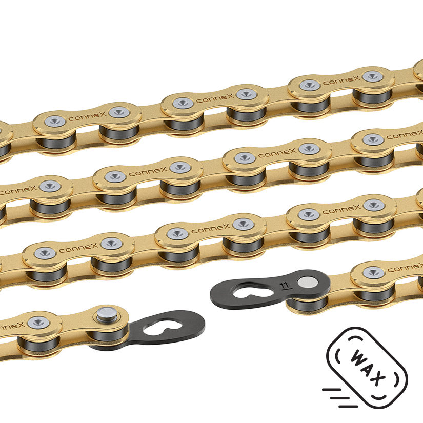 This high-grade brass coated chain adds some bling and is perfectly suited for every terrain. The high-performance wax forms a solid protective layer against dirt and reduces wear. Connex’s special formula Wax with high quality SCA anti-wear additives measurably reduces friction between pins and chain links for a more enjoyable ride. Waxed chains not only deliver more power to the sprockets, they are also easier to care for and maintain.